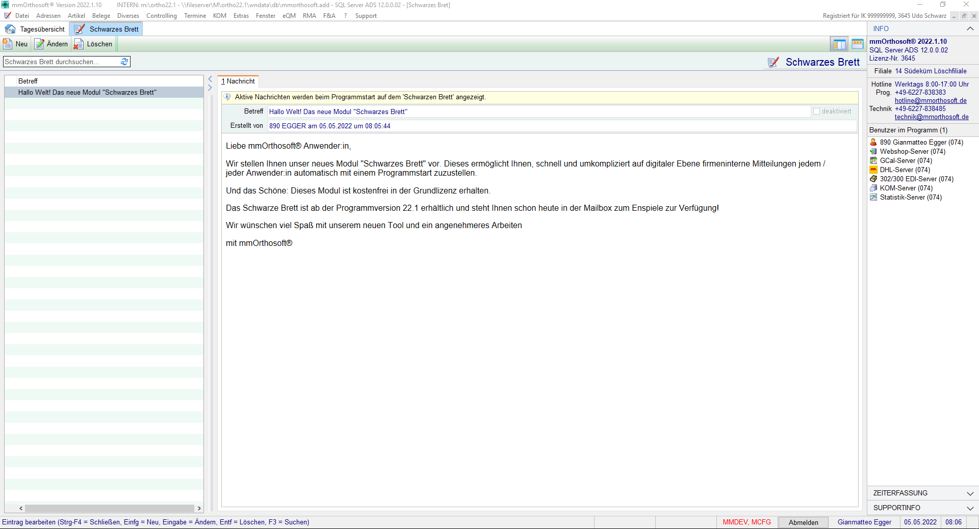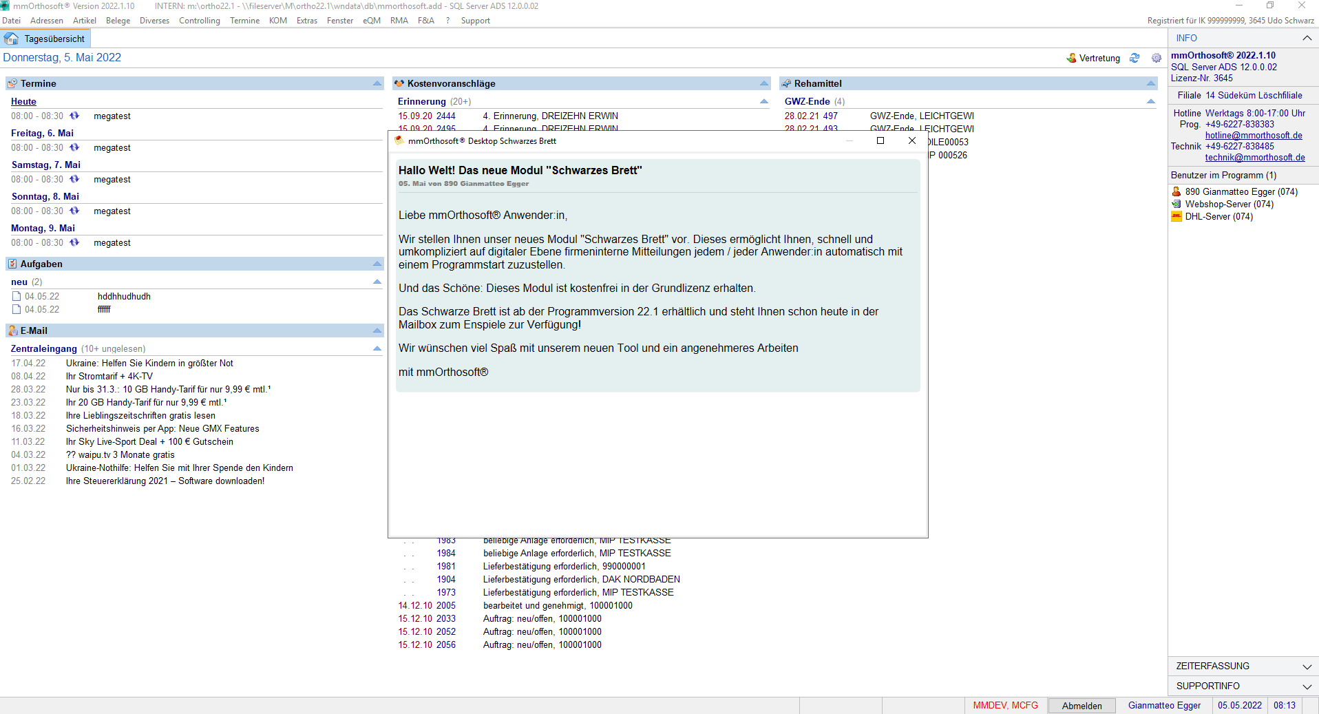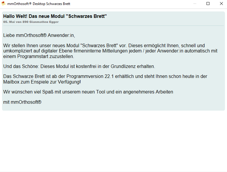 Diese Funktion ist ab der Programmversion 22.1 verfügbar und wird beim Programmstart jedem Mitarbeiter direkt nach der Anmeldung angezeigt.