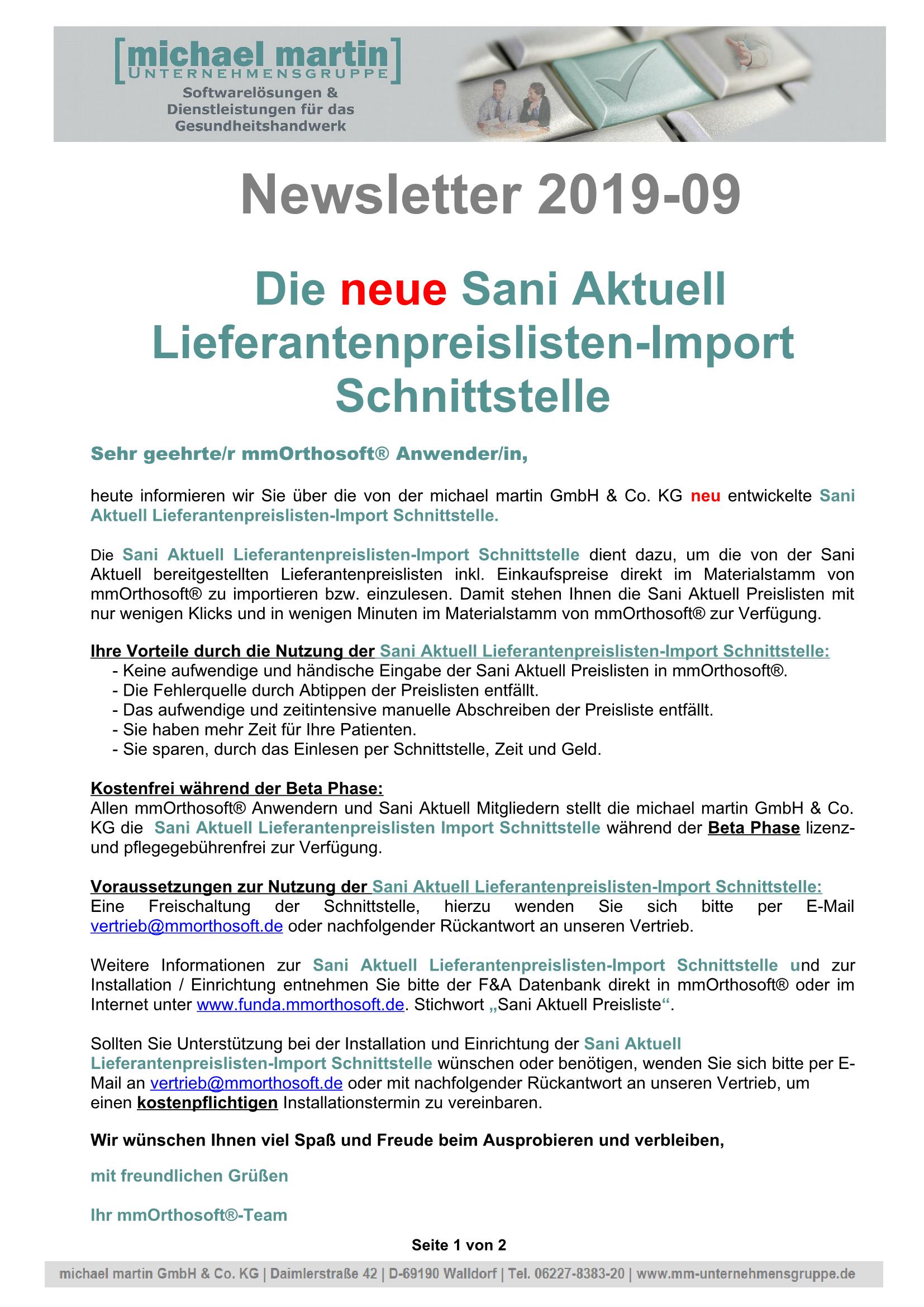 16.10.2019 NEWSLETTER "Sani Aktuell Lieferantenpreislisten Import Schnittstelle"
