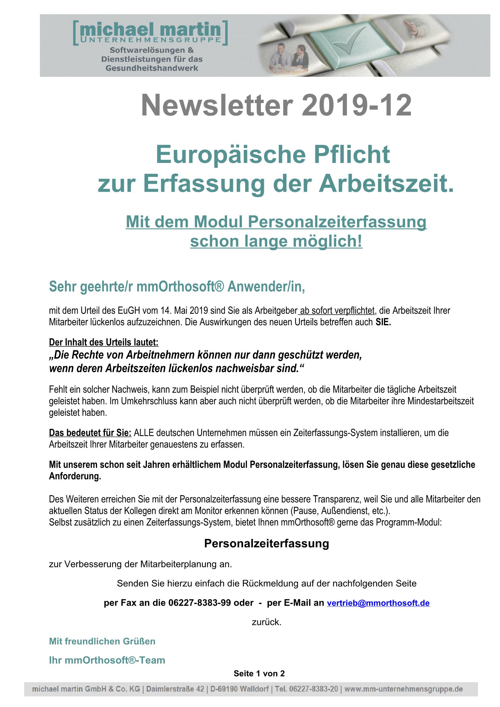 12.11.2019 NEWSLETTER "Urteil zur Personalzeiterfassung"
