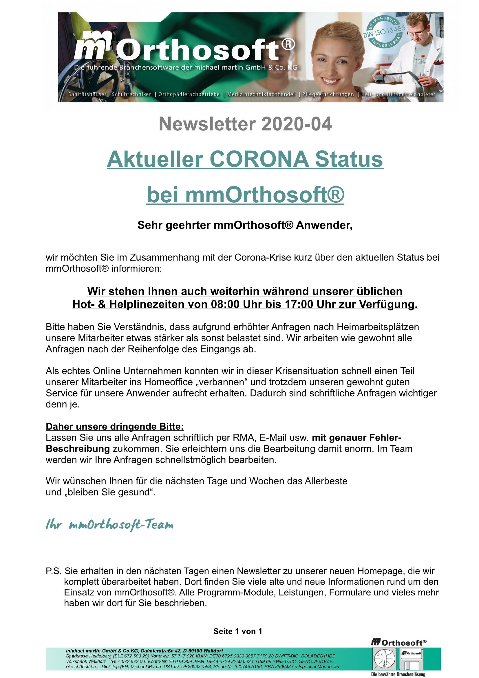 26.03.2020 NEWSLETTER "Aktueller Status Corona"