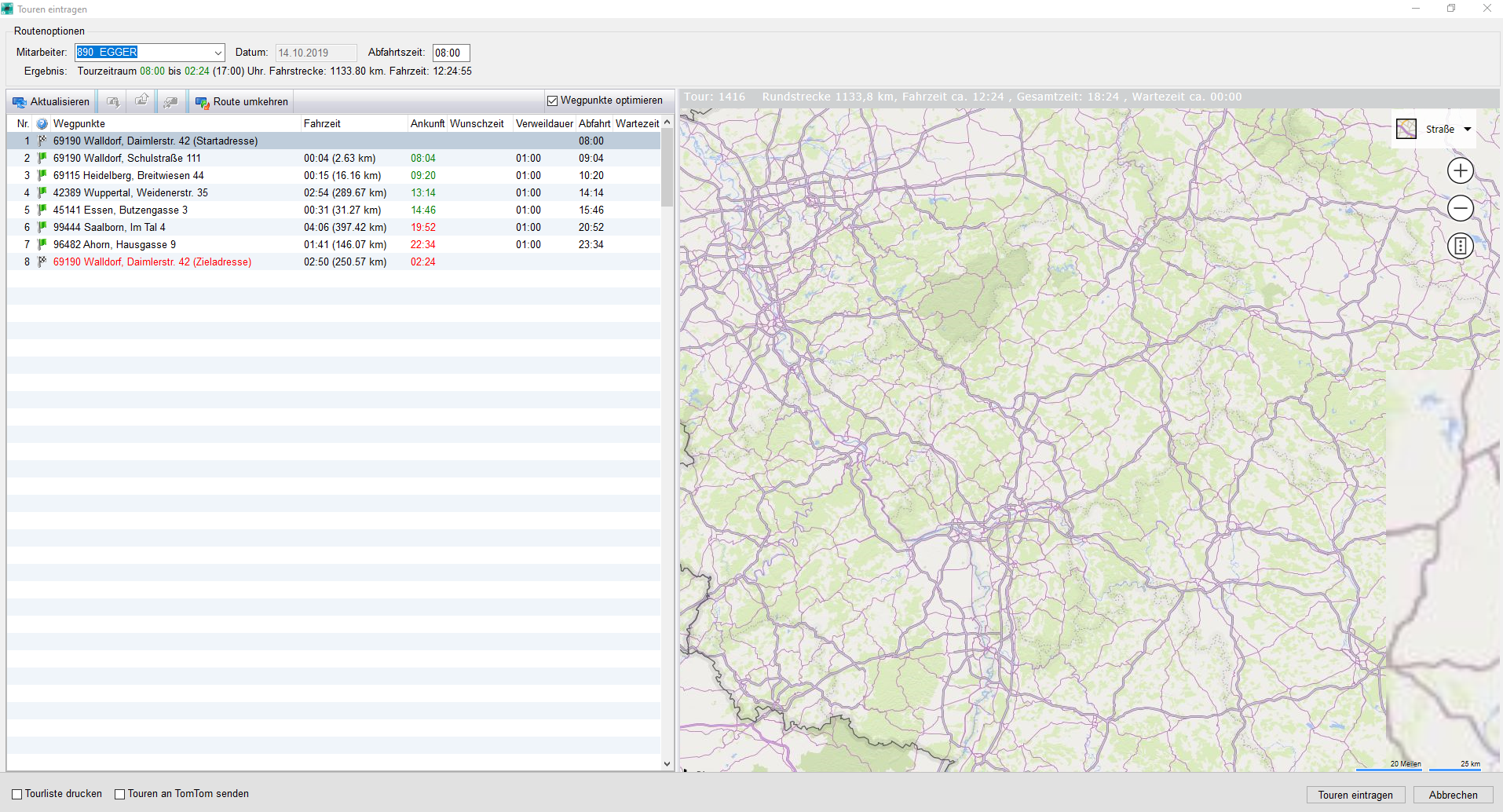 - Manuelles Verteilen der Touren auf Mitarbeiter oder Fahrzeuge.