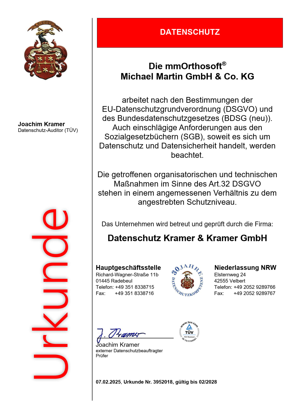 Hinweis: opta data Ortho Solution GmbH überträgt Daten von Ihrem System nur mit Ihrer Zustimmung und wertet diese Daten nicht statistisch aus, noch gibt sie Michael Martin GmbH & Co. KG an Dritte weiter. Bei jeder Datenübertragung geht opta data Ortho Solution GmbH davon aus, dass sich eine jeweils gleichlautende Datensicherungskopie auf einem separaten Datenträger in Ihrem Haus befindet. Im Falle eines Datenverlustes auf dem Wege des Transfers ist sichergestellt, dass die Originaldaten bei Ihnen vorhanden sind.