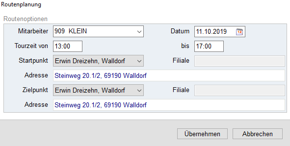 - Manuelle Anpassung der Abfahrt- oder Zieladresse